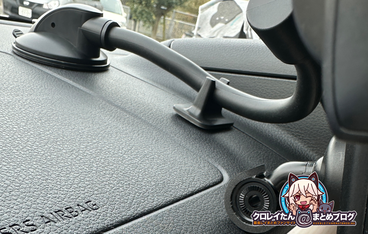 この製品は吸盤からホールドパーツまでのアームが長いため、私の環境では助手席のエアバッグ部分に干渉しない様に設置したかったこともあって、どんぴしゃでした。