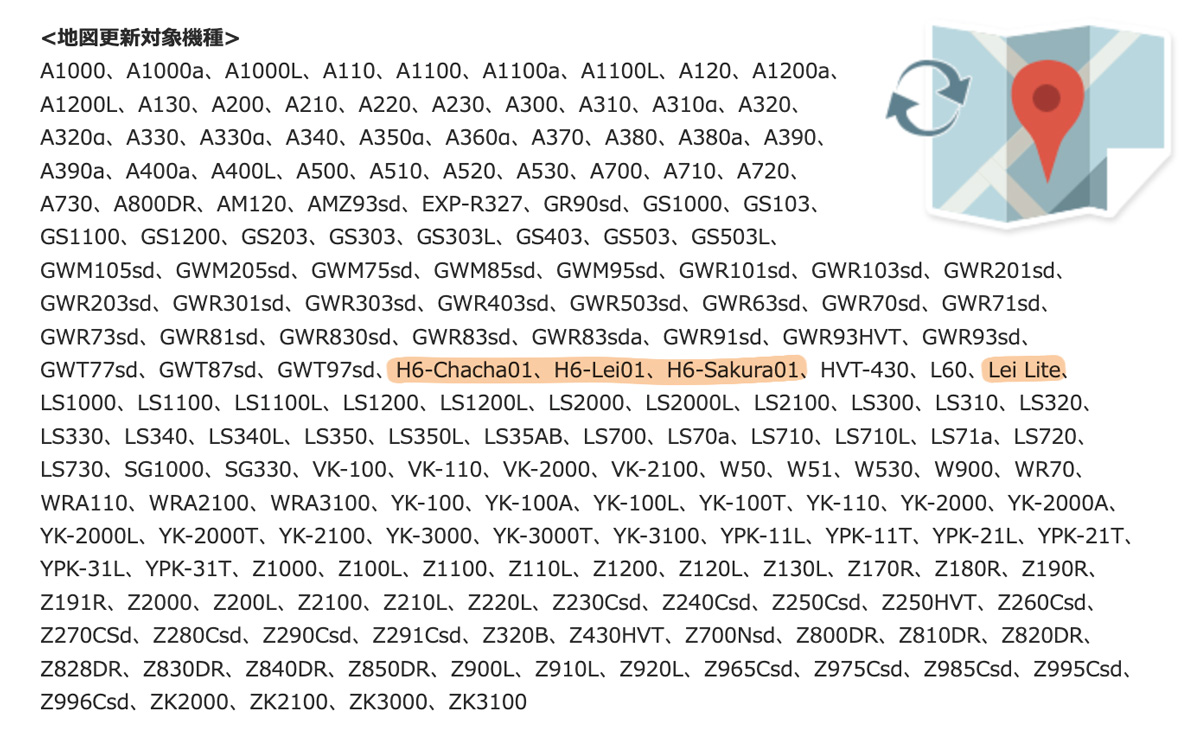 「H6-Lei01」、「H6-Sakura01」、「H6-Chacha01」がしっかり地図更新対応機種として記載されています(*´ω`*)