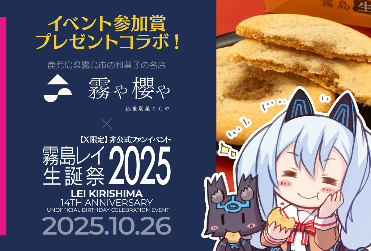 参加賞の賞品について、公式霧島レイ生誕10周年記念のときに「霧島レイ生サブレ」を製造販売されていました『霧や櫻や・徳重製菓とらや』様とコラボします。